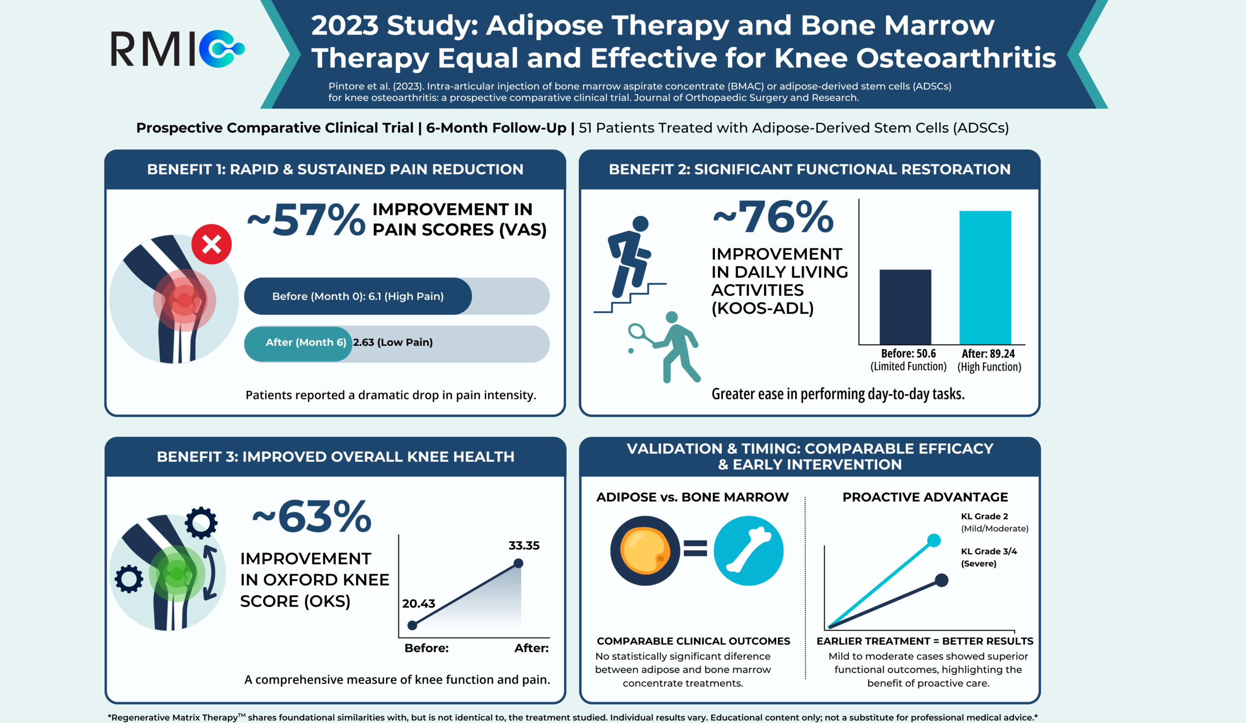 This research examined intra-articular BMAC and ADSCs injections, the latter of which shares foundational similarities with (but is not identical to) Regenerative Matrix Therapy™, RMIC’s next-generation adipose-based biologic treatment. Our protocol has been reviewed by Health Canada without objection and is delivered in our licensed clinics across Canada.