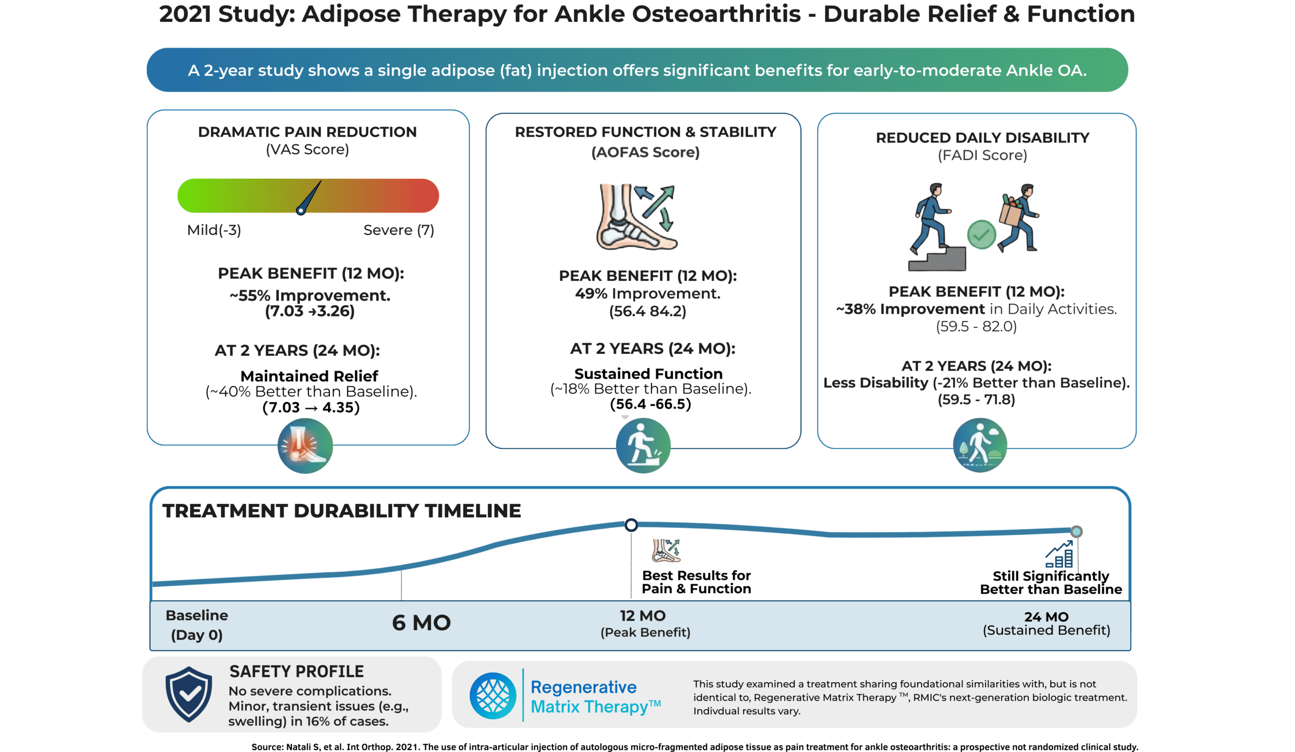 At RMIC, we see this kind of study as directionally supportive of Regenerative Matrix Therapy™ for appropriately selected patients with ankle OA. Regenerative Matrix Therapy™ shares foundational similarities with the adipose-based approach used here—using your own fat tissue in a minimally invasive, image-guided procedure—but it is not identical, and results can vary from person to person. Our treatment protocol was reviewed by Health Canada with no objection and utilizes Precision Adipose Modulation™ to maximize the impact of the injection.