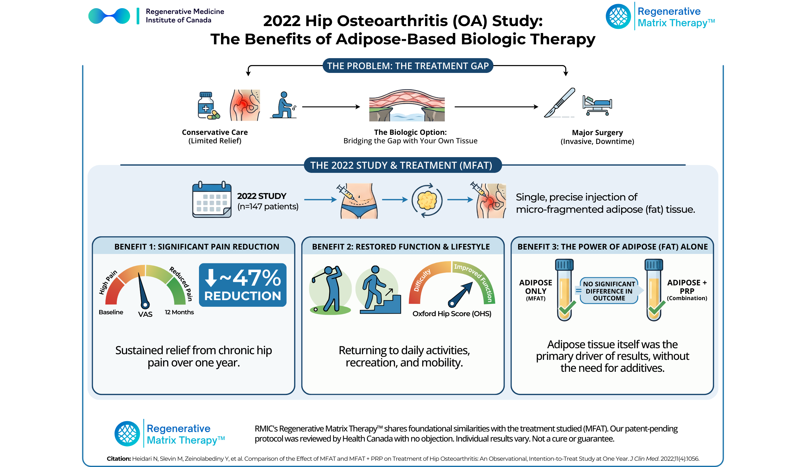 This study examined micro-fragmented adipose tissue (MFAT), a treatment that shares foundational similarities with Regenerative Matrix Therapy™, RMIC’s next-generation adipose-based biologic treatment. Our protocol was reviewed by Health Canada with no objection and is delivered under a physician-led framework focused on safety and patient selection.